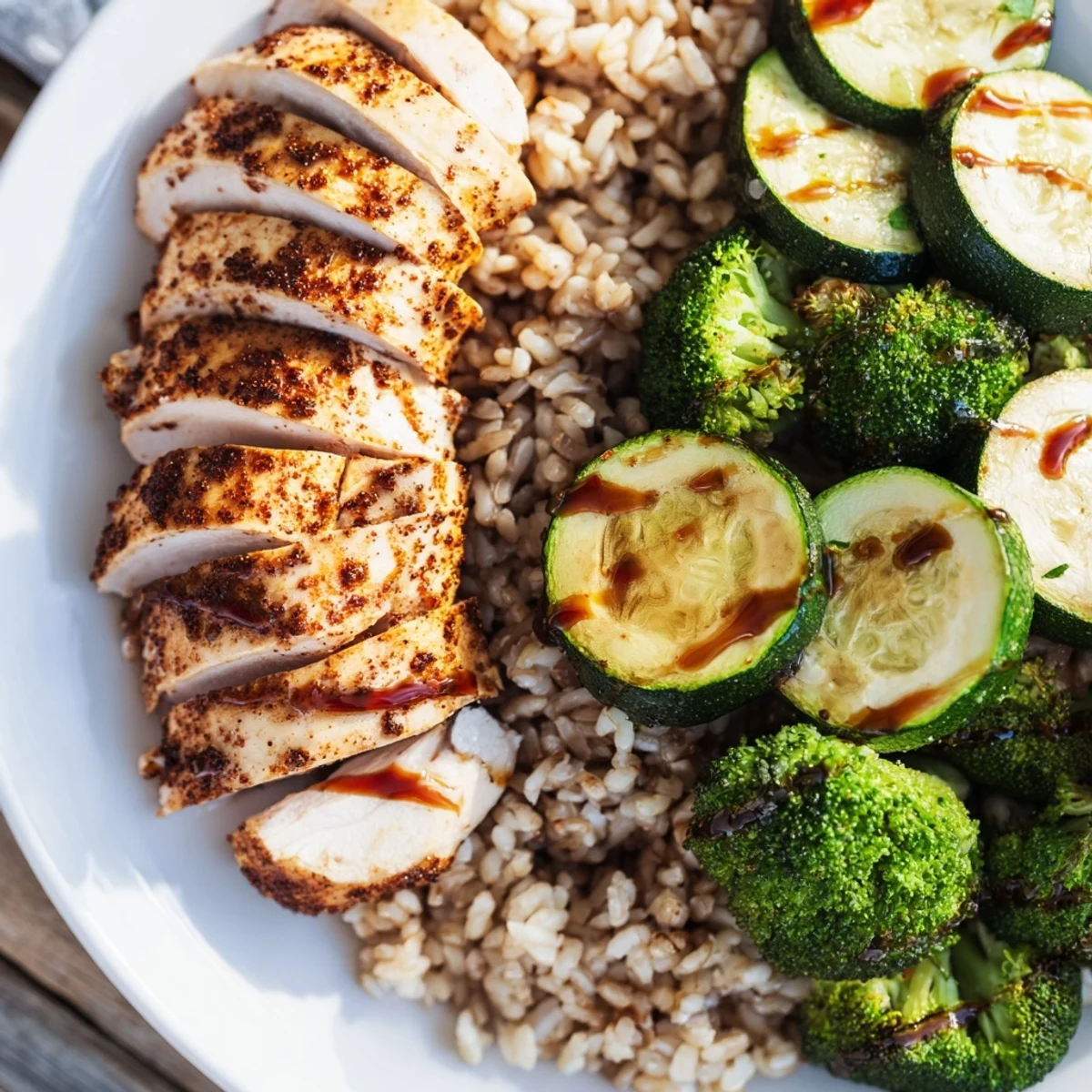 This simple dish combines juicy chicken breasts seasoned with paprika, garlic, and oregano, roasted alongside a colorful mix of bell peppers, zucchini, onion, and broccoli. Paired with fluffy brown rice cooked to perfection, it offers a healthy and satisfying option for busy days. Optional sauce with soy, honey, and sriracha adds a tasty kick. Easy to prepare and perfect for meal prepping to enjoy throughout the week.