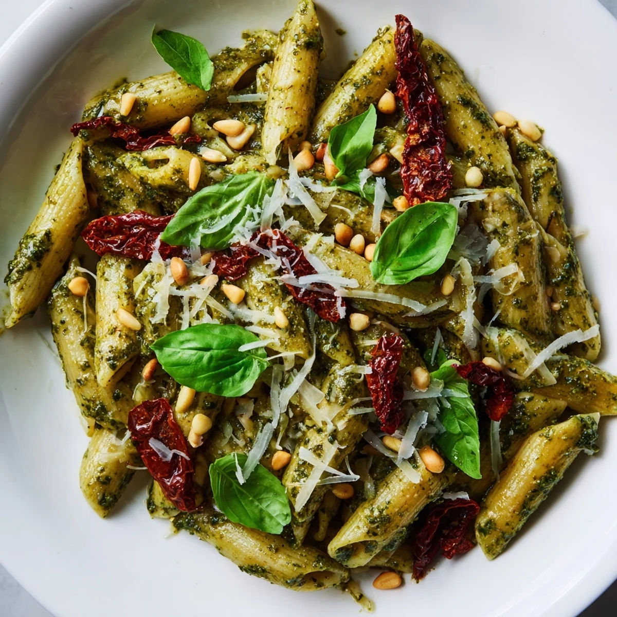 This dish features pasta coated in a fresh basil and pine nut blend, enriched with Parmesan, garlic, and lemon juice to create a creamy pesto. Sun-dried tomatoes add a tangy depth that complements the vibrant herbaceous sauce. Prepared quickly by boiling pasta and combining it with the pesto, it’s an easy yet deliciously satisfying meal. Garnish with extra Parmesan and fresh basil for added aroma and flavor.
