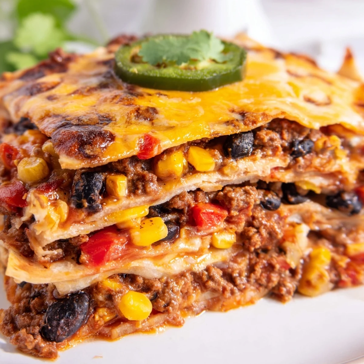 - Repeat layers twice more with tortillas, meat mixture, and cheese, then top with a final layer of tortillas and remaining cheese