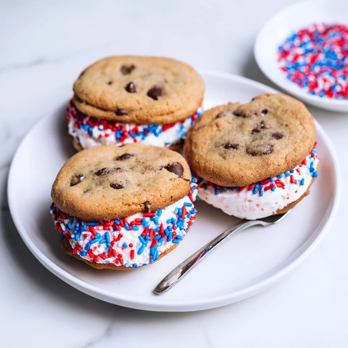 These festive frozen treats combine mini chocolate chip cookies with creamy vanilla ice cream, creating the perfect handheld dessert for summer celebrations. The sandwich edges get coated in vibrant red, white, and blue sprinkles, adding both visual appeal and a delightful crunch to every bite.