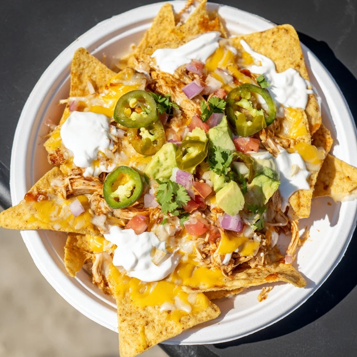 This dish features crispy tortilla chips layered with tender, shredded chicken seasoned with chili powder and smoked paprika. Melted cheddar and Monterey Jack cheeses add creamy richness, while fresh jalapeños provide a spicy kick. Diced tomatoes, avocado, red onion, and cilantro offer brightness and texture. Finished with a drizzle of sour cream and lime wedges, it’s an easy-to-prepare, flavorful Tex-Mex inspired dish perfect for sharing.
