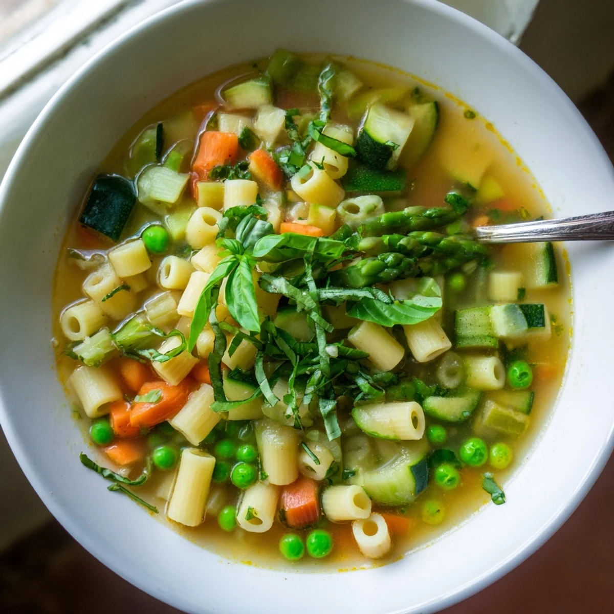This vibrant spring minestrone celebrates the season's freshest vegetables. Tender asparagus, sweet peas, and zucchini simmer with small pasta in a flavorful tomato-based broth. A splash of lemon juice brightens the bowl, while fresh herbs add aromatic depth.